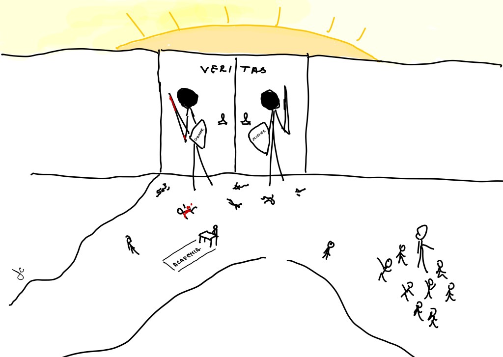 The image represents the state of the ‘academy’ today. The individual on the left is the seeker of wisdom (student, philosopher), who walks to the doors of truth and is greeted by the admissions counselor (the academy, tuition). Before the doors of truth (veritas) stand two faceless guardians (anonymous reviewers, paywalls). The way is barred. There is no pathway to truth. To the right stands the sophist (skeptic, teacher) who leads students to ‘safety’, away from truth.